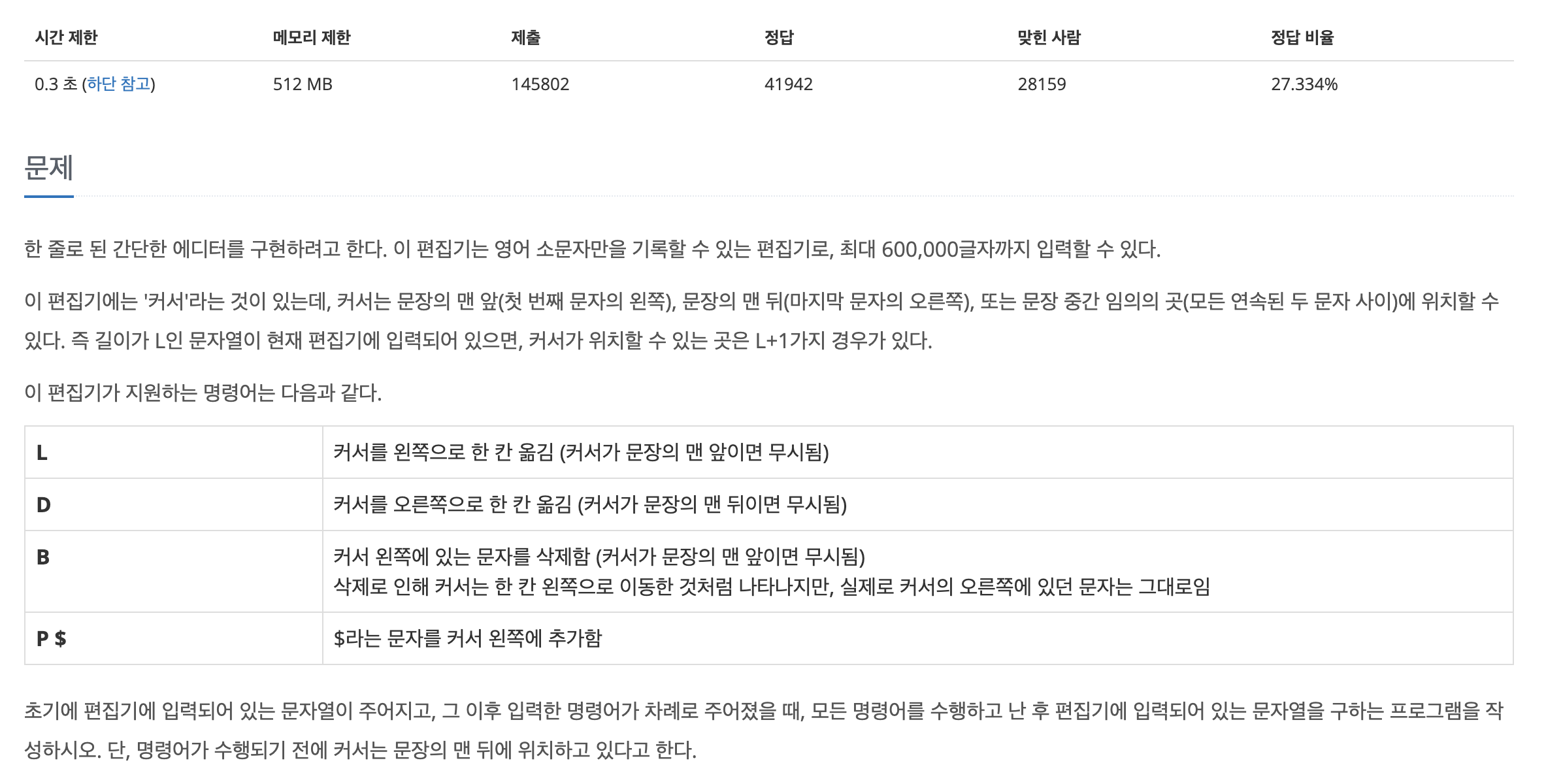 https://www.acmicpc.net/problem/1406 문제 조건명령어와 커서 위치에 따라 문자열 편집L : 커서 왼쪽으로 한 칸 옮기기D : 커서 오른쪽으로 한 칸 옮기기B : 커서 왼쪽에 있는 문자 삭제P $ : 커서 왼쪽에 문자 $ 추가모든 명령어는 불가능할 경우 무시 접근 방식시간 제한이 0.3초라 무조건 시간초과가 날 거 같았지만 일단 쌩으로 구현해보고 생각해보기로했다.pop과 insert를 사용해서 먼저 구현하고, 그 후에 rotate를 사용해서 구현했다.결론은 둘 다 시간초과가 나고, 도저히 생각이 안나서 다른 블로그를 참고했다. 내가 처음에 실패한 코드는 커서를 인덱스 번호로 생각하고 실제로 해당 값을 추가하거나 삭제하는 방식으로 구현했다.블로그에서 참고한 코드는 커서를 기준으..