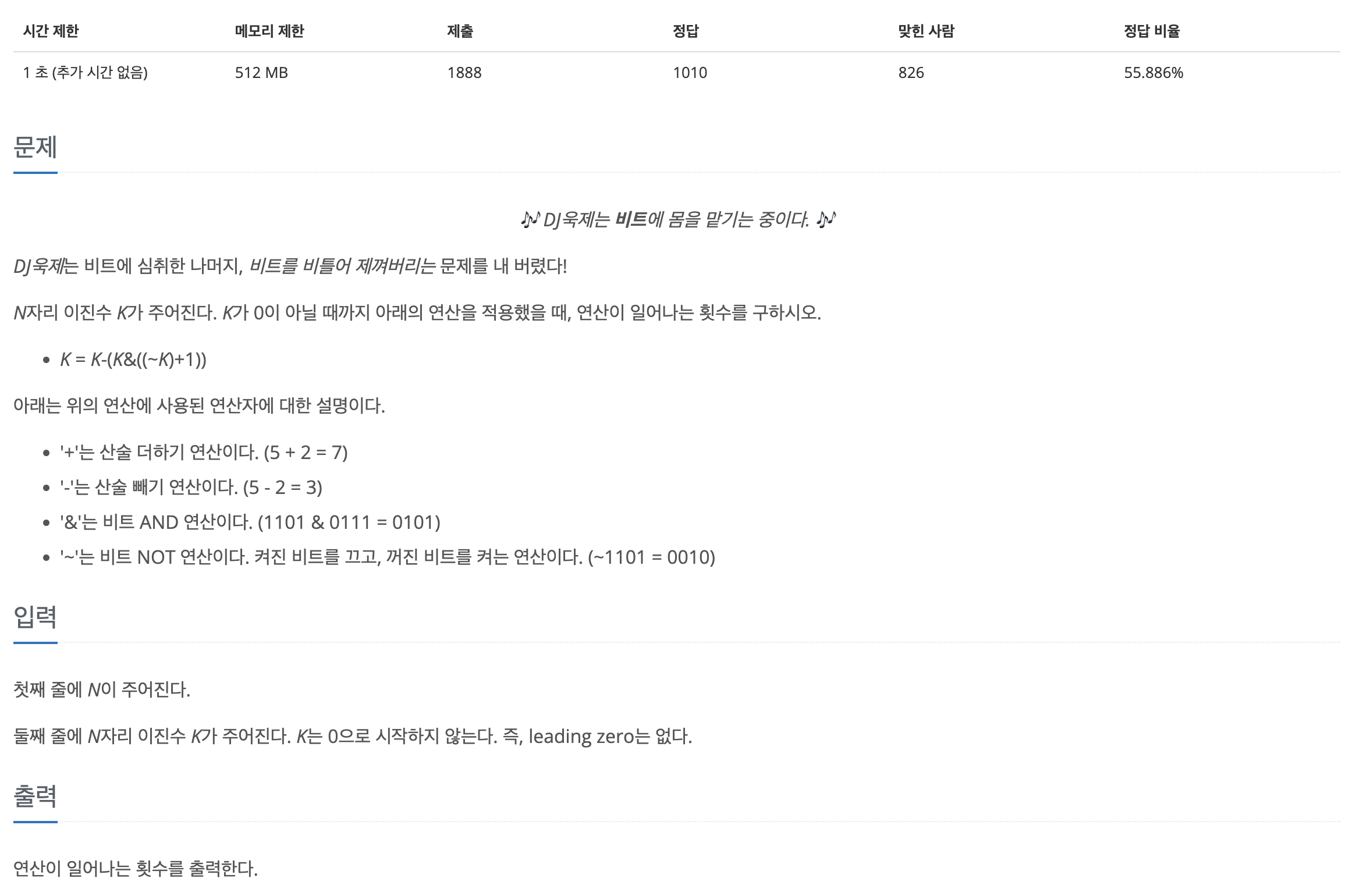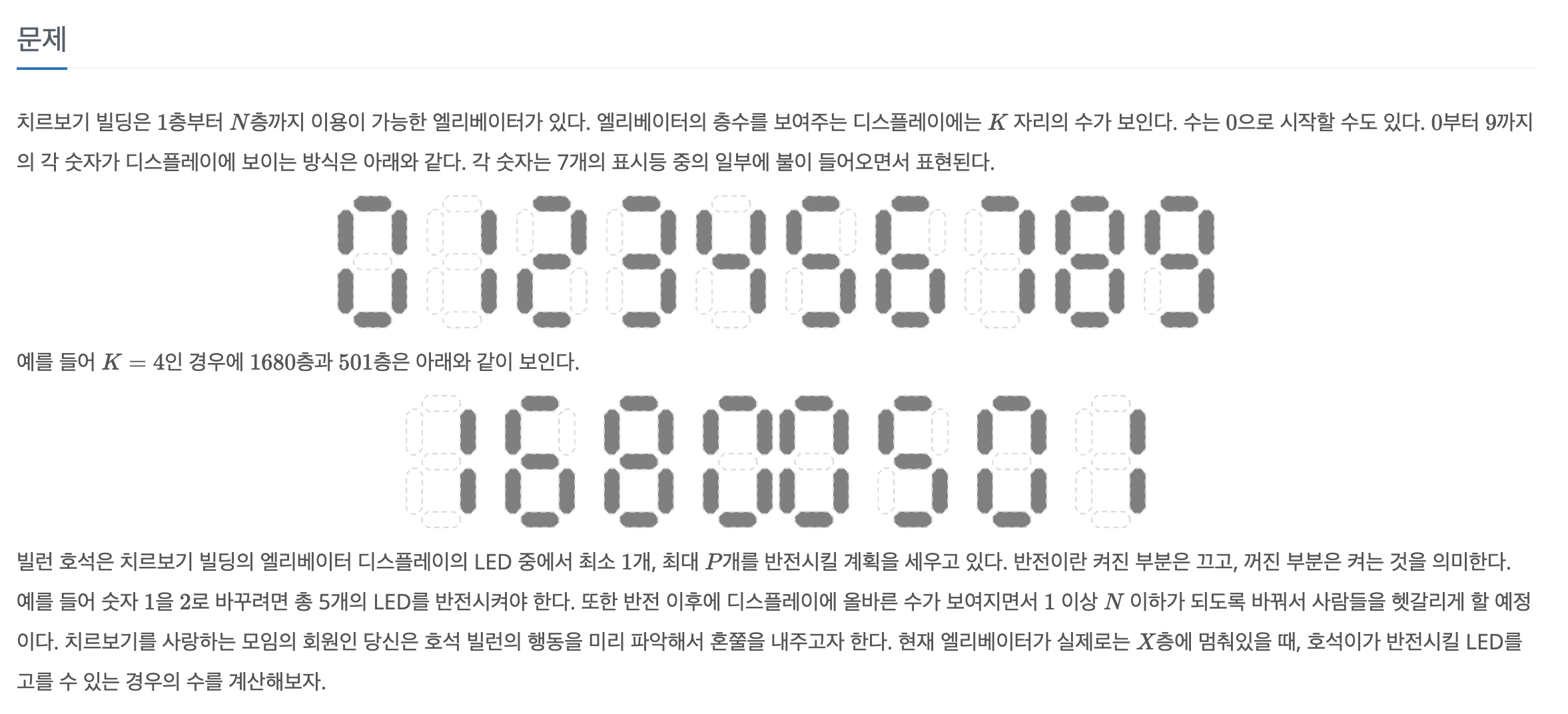 https://www.acmicpc.net/problem/22251 문제의 이미지 보고 비트연산으로 풀어야겠다고 생각했다.근데 비트연산 제대로 써본적이 없음... 일단 비트 연산자 먼저 공부했다. 1. 껐다켰다 할 수 있는 LED는 총 7개 -> 7자리 이진수로 변환하여 나타냄2. 1부터 N까지의 수를 하나씩 순회 -> 현재 K층의 숫자에서 몇개의 LED를 바꿔야하는지 계산 (XOR 연산)3. 바꾼 LED를 세서 P개 이하라면 result += 1 실패 코드# python 시간초과, pypy 2068msLED = { "0": '1110111', "1": '0010010', "2": '1011101', "3": '1011011', "4": '0111010', "5": ..