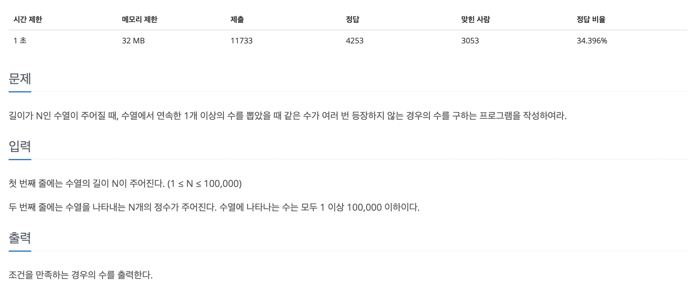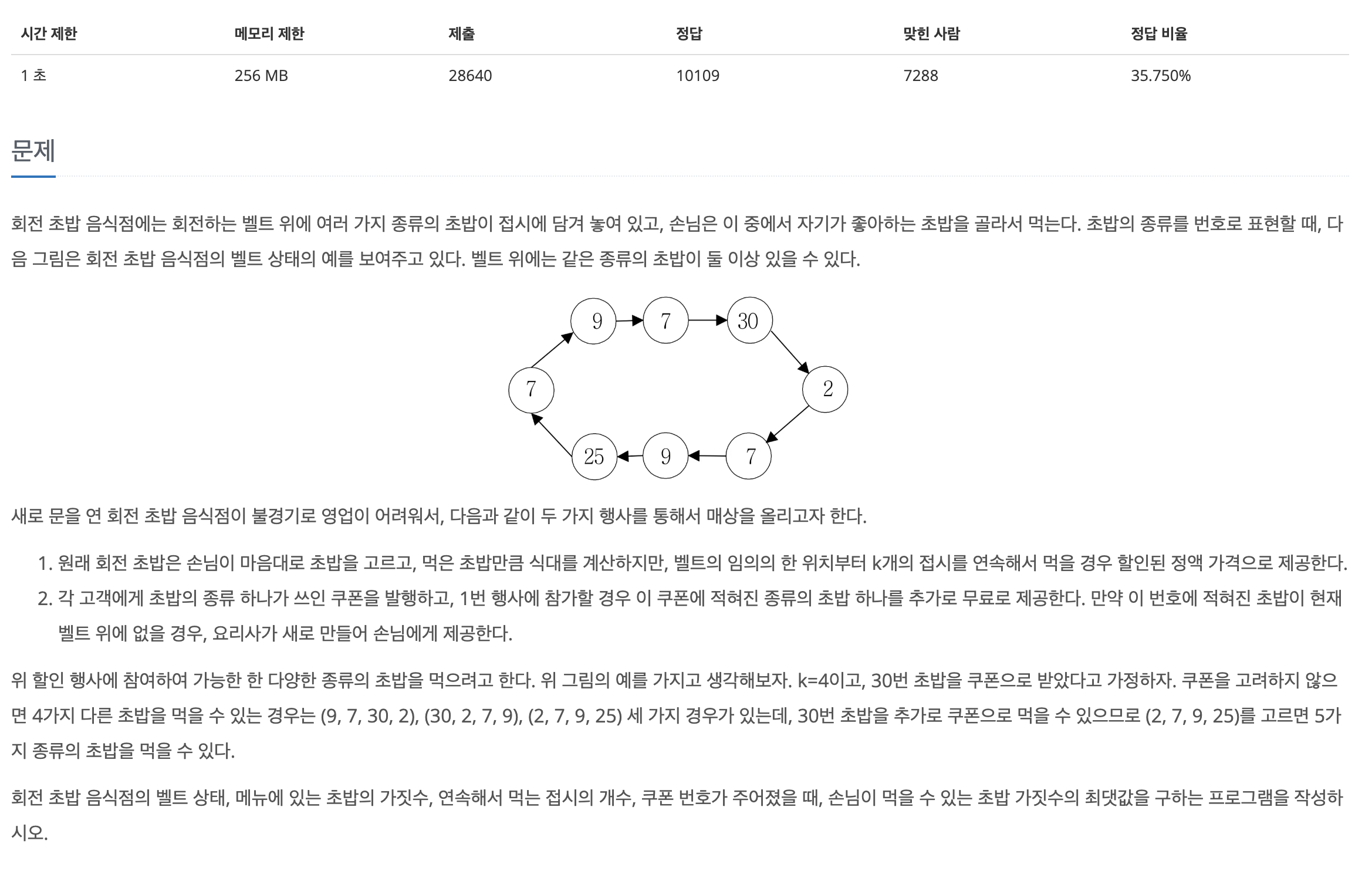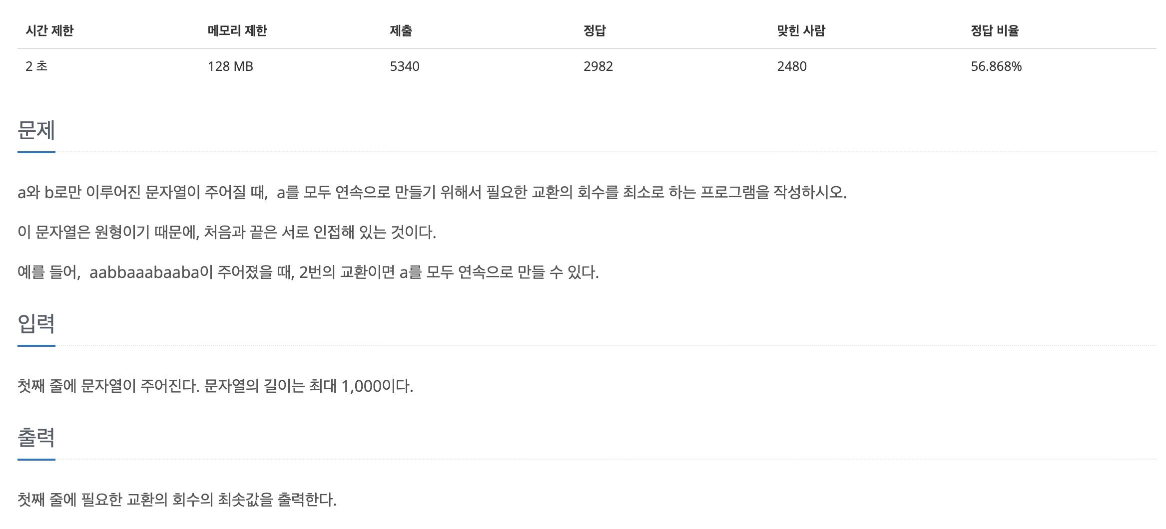 https://www.acmicpc.net/problem/1522 문제 조건은1. 모든 a를 한곳에 모아야한다2. 문자열은 원형 구조라 처음과 끝이 이어져있다. 따라서 문제 풀이는1. 최종 완성되어야할 연결된 a의 수 구하기2. 문자열은 원형구조이므로 두배로 이어 붙이기3. 문자열 i부터 i+a 까지 슬라이싱해서 그 안에 있는 b의 수의 최솟값 구하기 # 성공 코드const str = require("fs").readFileSync("/dev/stdin").toString().trim();const aCnt = [...str].filter((c) => c === "a").length;const strDouble = str + str;let result = Number(Infinity);for (let ..